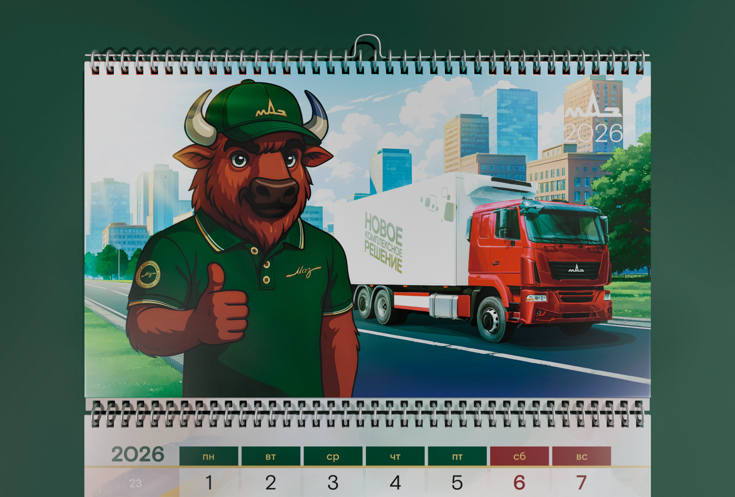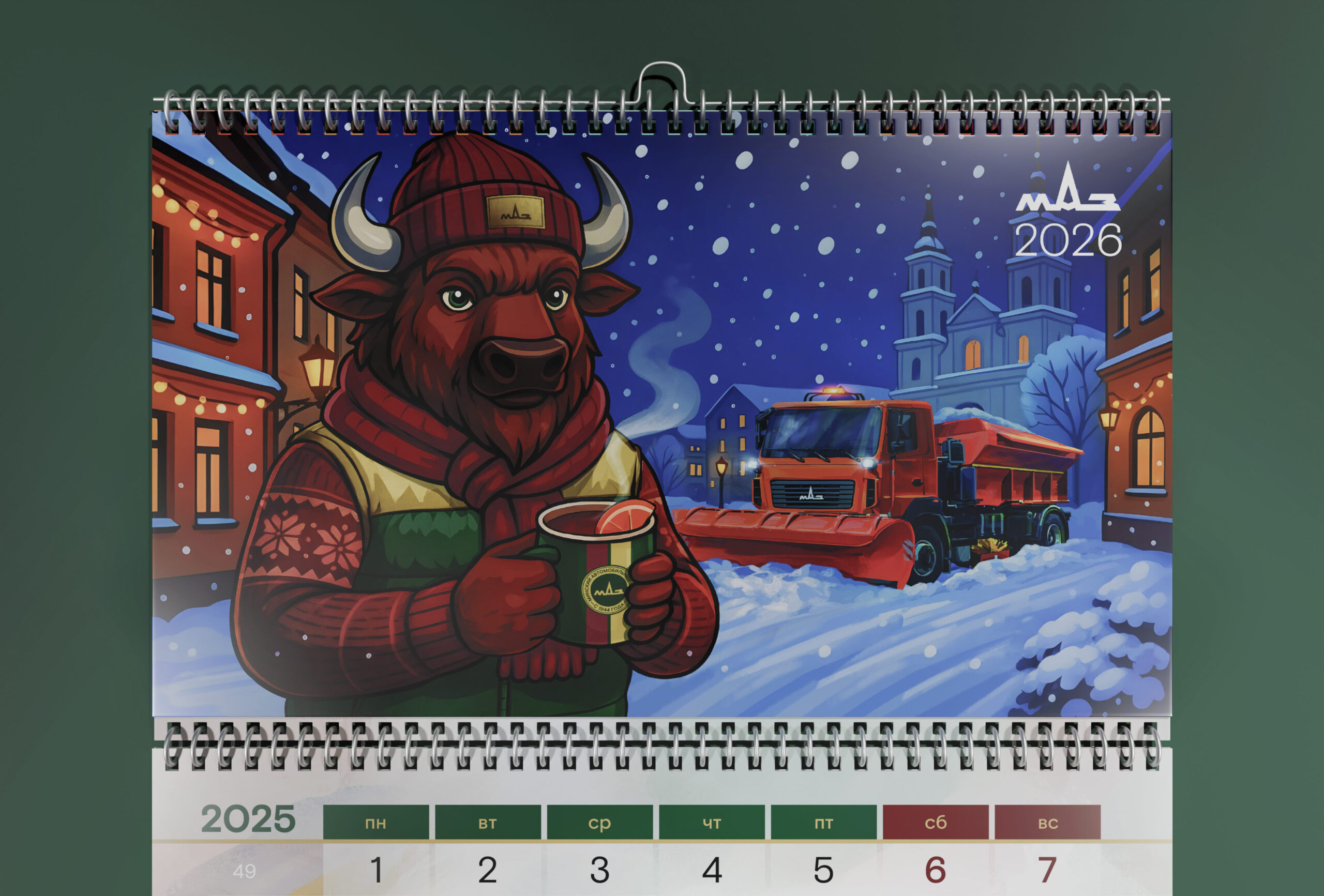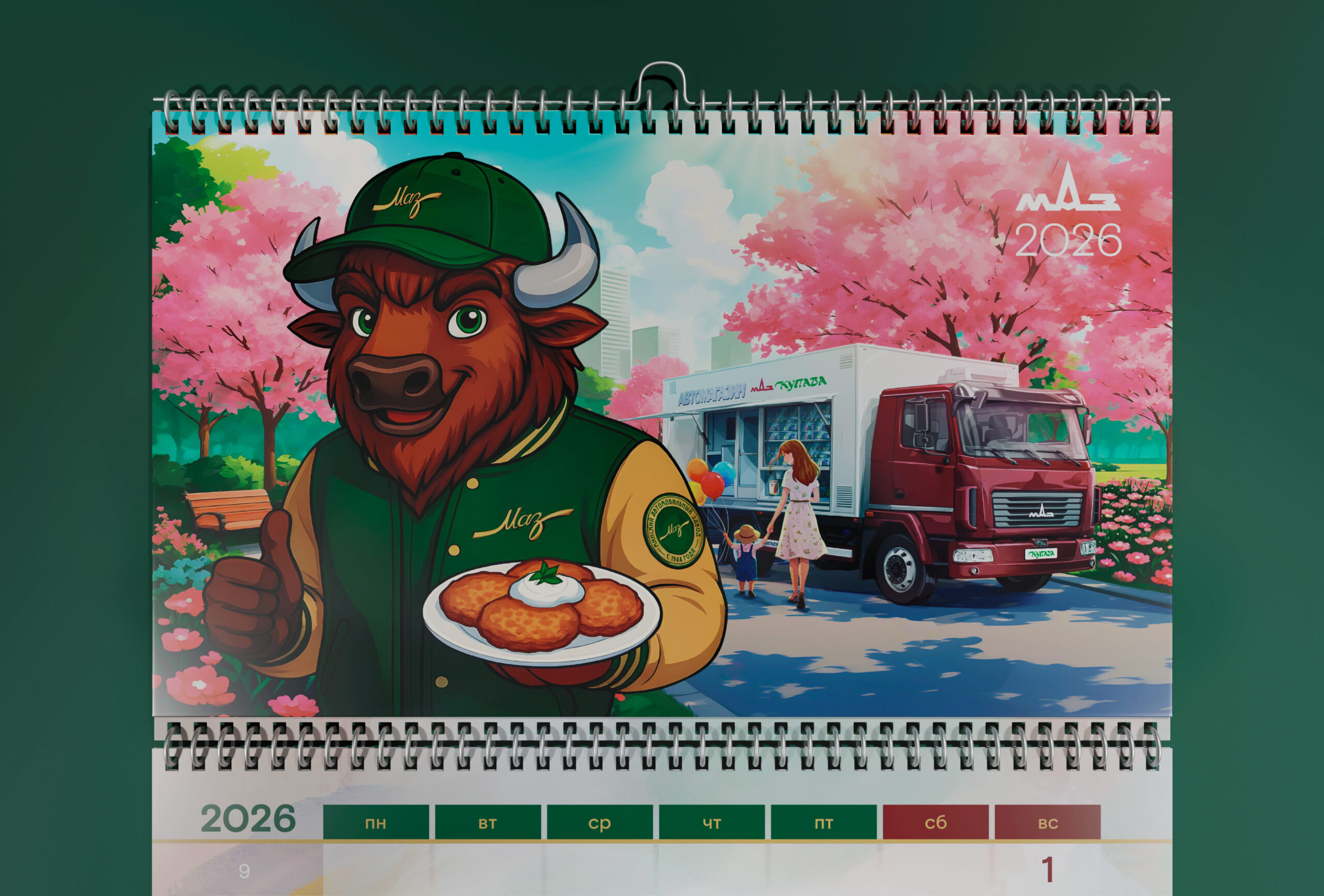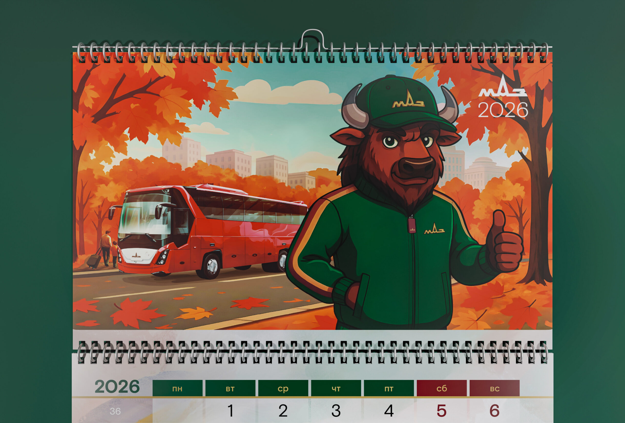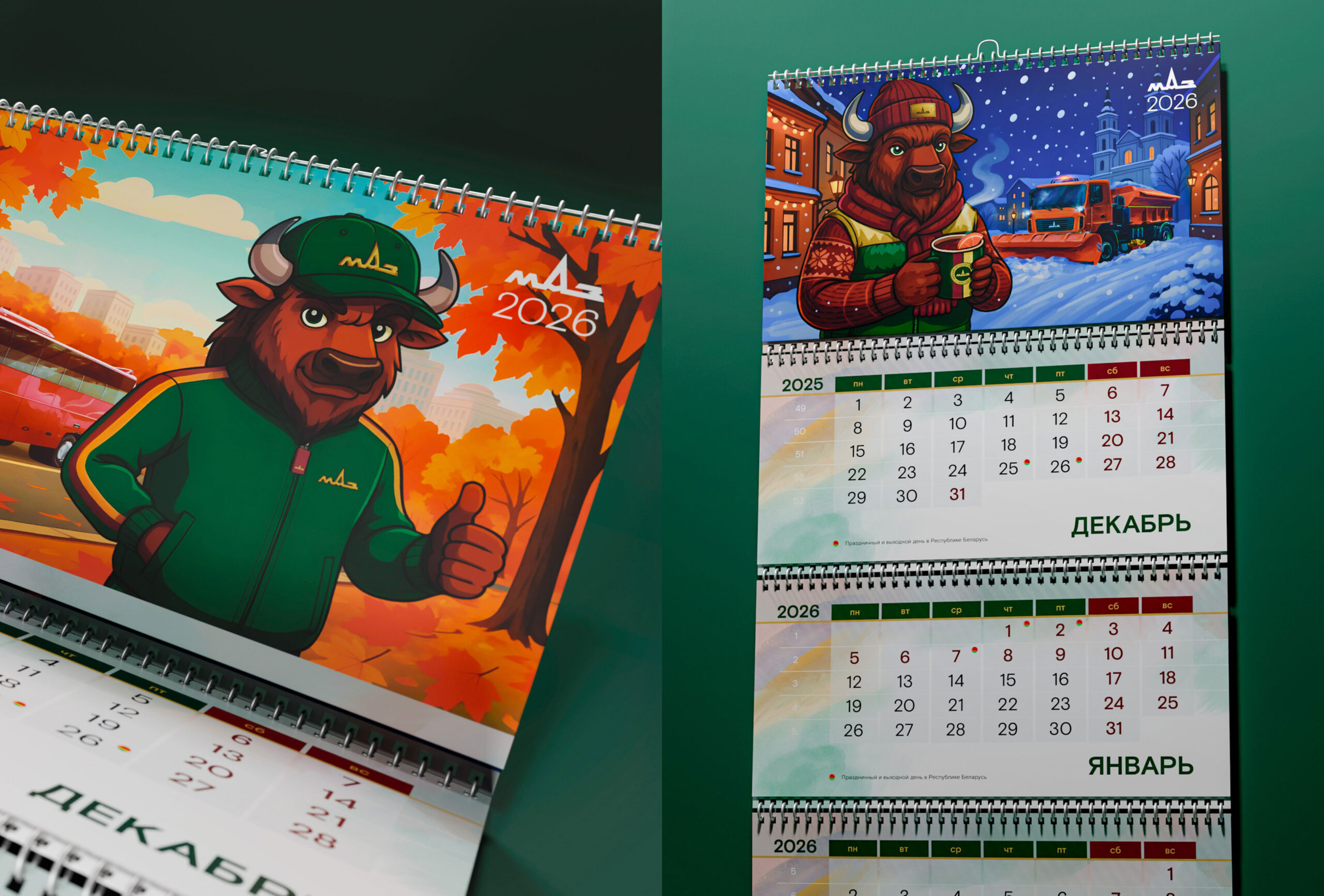 Разработка эксклюзивного квартального календаря с многостраничным топпером в стиле иллюстрации по временам года с техникой МАЗ и корпоративным маскотом, одетым в фирменную брендированную коллекцию одежды.